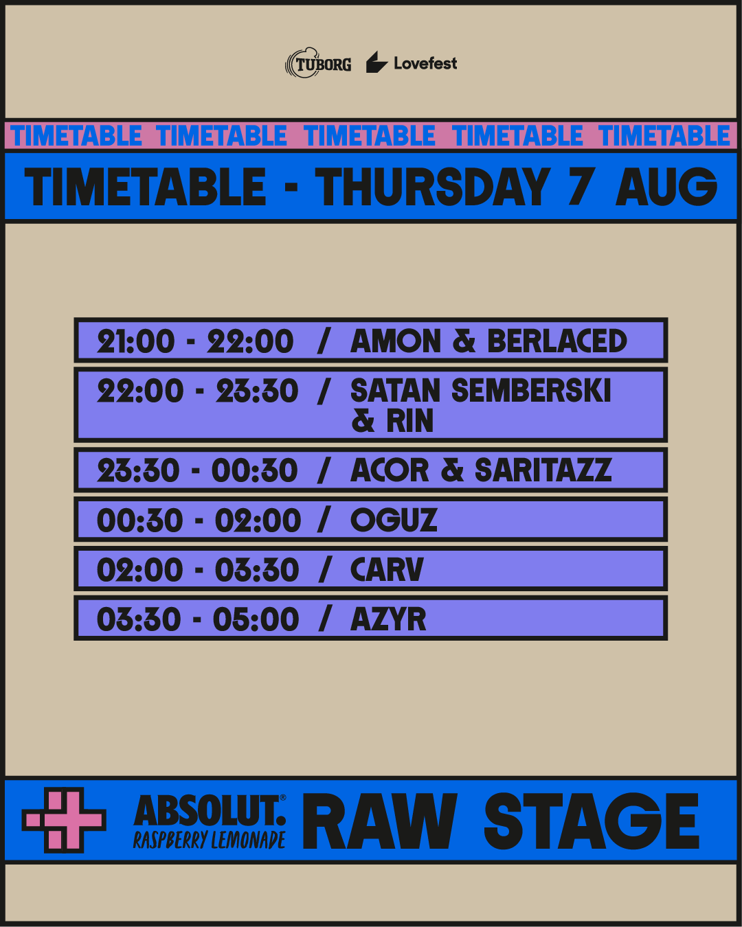 Absolut RAW Stage postaje centar okupljanja hard techno fanova koji će imati priliku da čuju najveće zvezde nove generacije hard techno zvuka. CARV, OGUZ, AZYR, kao i lokalni b2b sastavi ACOR i SARITAZZ, Amon i Berlaced, Satan Semberski i Rin čine četvrtak na Absolut RAW Stage-u nezaobilaznom tačkom za sve ljubitelje tvrđeg zvuka.
