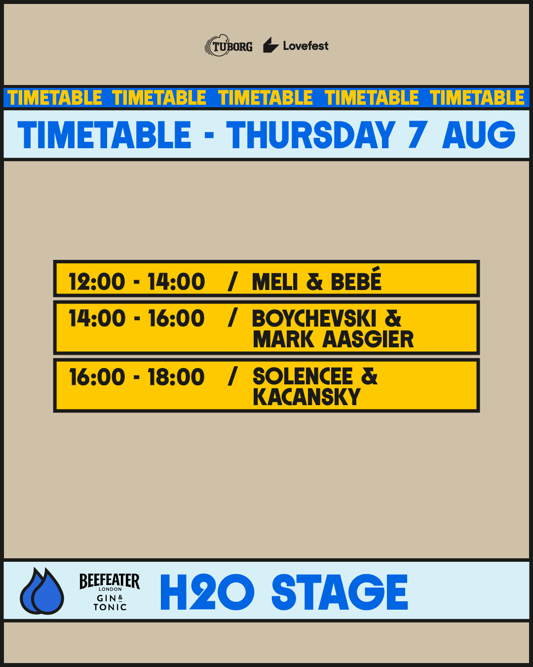 Od podneva do 18 časova, Beefeater H2O Stage na gradskom bazenu okuplja novu generaciju di-džejeva okupljenih u okviru Kult Talents kolektiva. Publika je uživala u intro setu Bebé i MELI, koje su svojim progresivnim melodijama, groove-om i tech-house zvukom podigle sve prisutne na noge. Da atmosfera nastavi istim tokom, zadužene su Kacansky, poznata po jedinstvenom spoju trancea, garage-a i house-a, i Solencee, koja u setovima kombinuje retro zvuk Ibice i Berlina, a za zatvaranje bazena Mark Aasgier i Boychevski sa svojim dinamičnim i žanrovski raznovrsnim setovima.