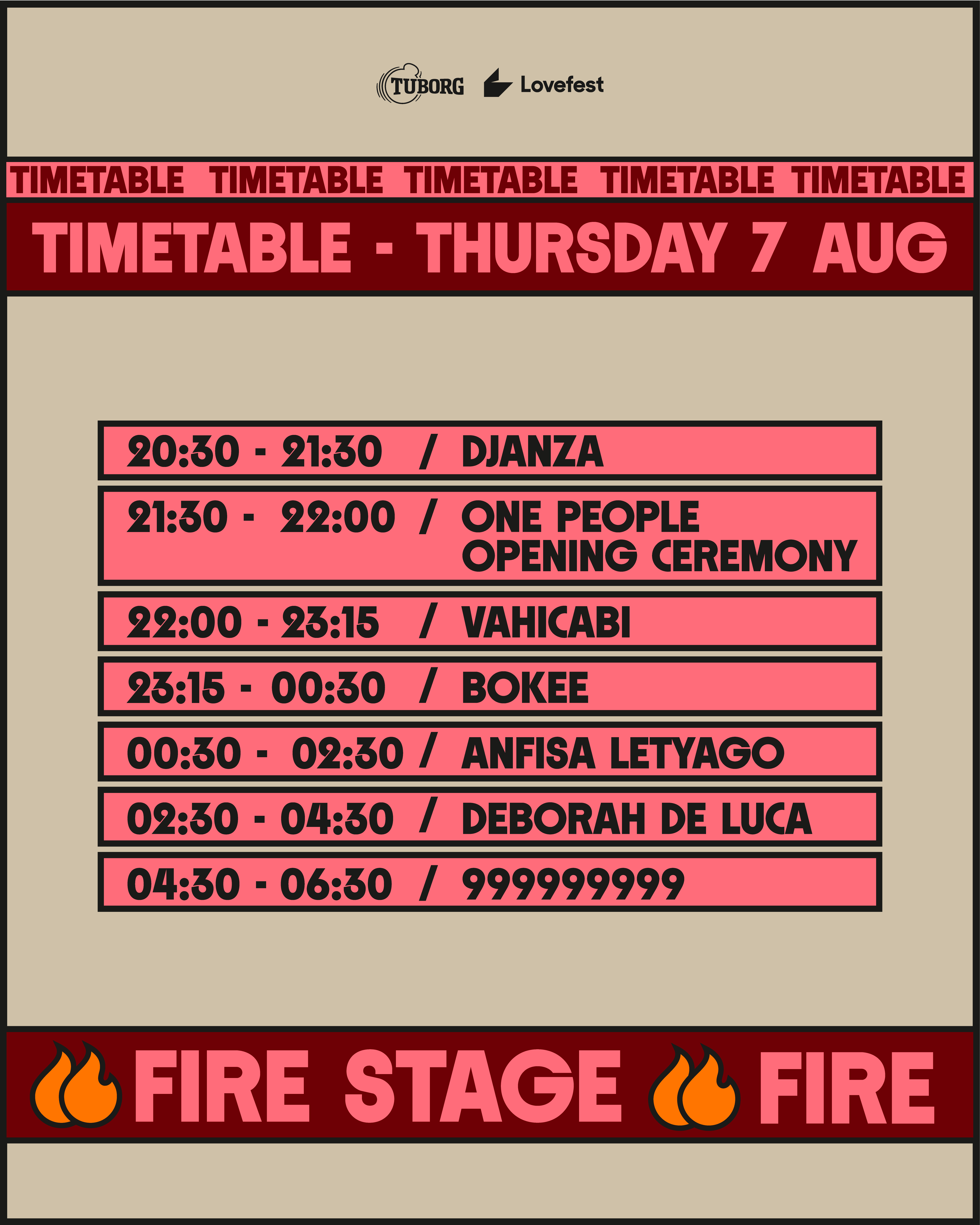 Od 20:30 časova kapije Tuborg Lovefesta se otvaraju za glavnu festivalsku zonu, gde se očekuje spektakularno otvaranje Fire Stage-a. Večeras publiku na glavnoj bini očekuju svetske zvezde elektronske muzike: italijanska techno diva Deborah de Luca, energični duo 999999999 i Anfisa Letyago, koja je nedavno proglašena za najbolju di-džejicu prema prestižnom Billboard Music Awards. Njihovi nastupi garantuju audio-vizuelni spektakl i potvrđuju status Vrnjačke Banje kao nezaobilazne destinacije na mapi regionalnih festivala. Domaću scenu na Fire Stage-u predstavljaju Vahicabi, Bokee, Djanza i kolektiv One People, koji svojom energijom i kvalitetom dokazuju da domaći izvođači imaju jednaku snagu kao i globalne muzičke zvezde.