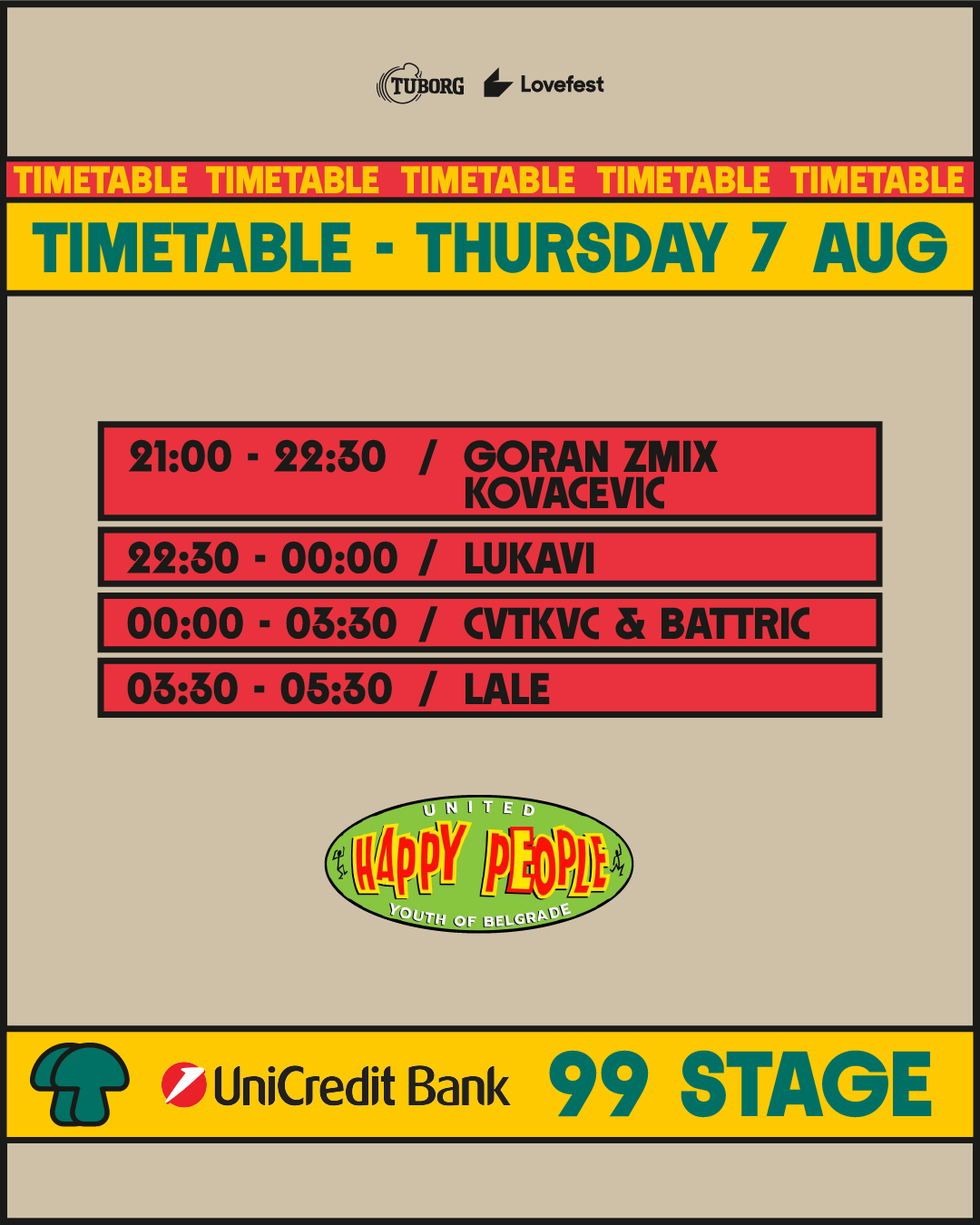 Iako četvrtak na 18. izdanju Tuborg Lovefesta protiče u znaku tvrdog techno i underground zvuka, UniCredit 99 Stage pruža osveženje za sve koji preferiraju house ritam — domaći kolektiv Happy People, donosi vedre house setove domaćih di-džejeva i dokaz da je domaća scena nezaobilazan deo Tuborg Lovefesta.